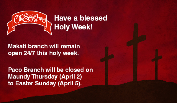 In celebration of Holy Week, we are glad to announce that our Makati branch will be serving you all this entire Holy Week 24/7.