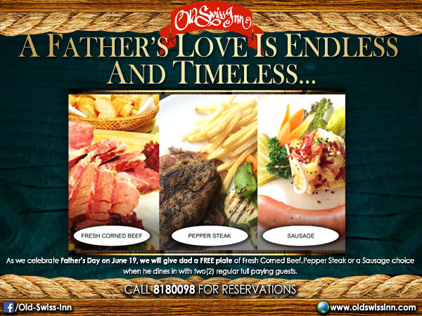 Give Papa, Daddy, Dada, or simply Father a treat he truly deserve. Celebrate Father’s Day at Old Swiss Inn and get a free plate of his choice : Fresh Corned Beef, Pepper Steak and Sausage for every 2 regular paying guests. That’s a delectable treat on July 19, Father’s Day. Let’s celebrate!