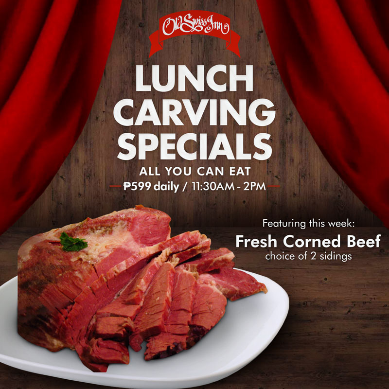 Did you already see this week’s Lunch Carving Special? Corned Beef all you can every 11:30am to 2:00pm from November 27, 2017 to December 3, 2017. Our corned beef carving station has always been a favorite. Enjoy our own corned beef brisket carved for your lunch plate with two sidings.