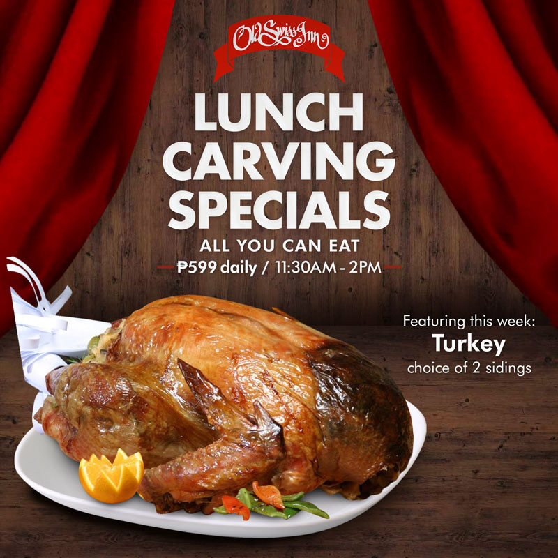 Since Christmas is nearing, we’ve chosen Turkey as our lunch carving special for the week. Enjoy UNLIMITED TURKEY with 2 sidings from 11:30 am to 2:00 pm for only 599 Pesos. Promo will run until Dec. 24 so bring your family and friends in Old Swiss Inn, Makati for lunch!
