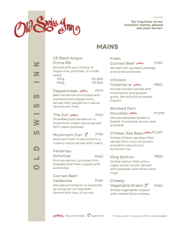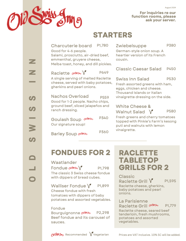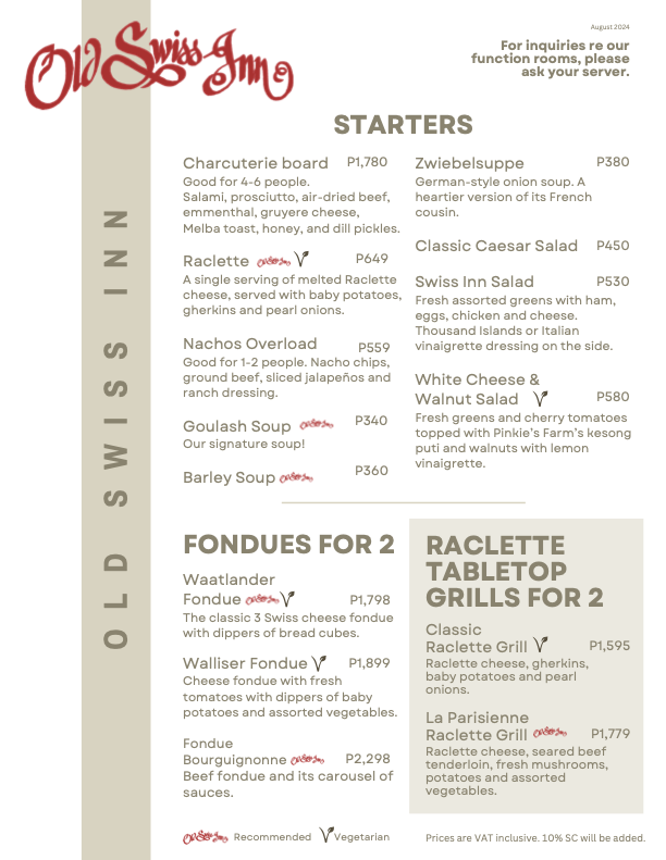 Ala Carte menu is available at the Old Swiss Inn Restaurant in Makati, G/F Olympia building, Makati Ave., beside Peninsula. Call 8818-8251 or 09189991010 for inquiries and reservations.