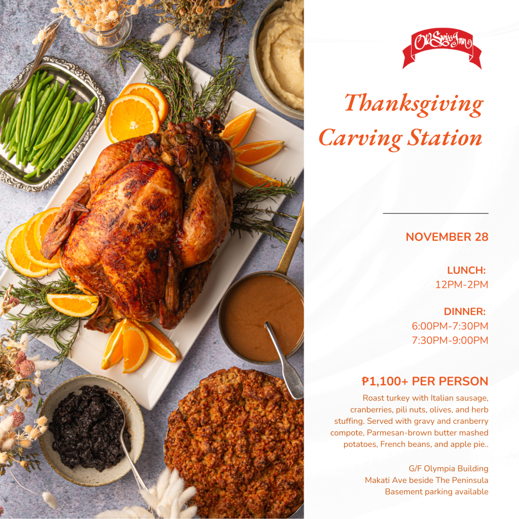 Our Thanksgiving Dinner Set serves 15 guests for just ₱15,000 and includes classic sides like savory gravy, cranberry compote, French beans, Parmesan brown-butter mashed potatoes, and apple pie.